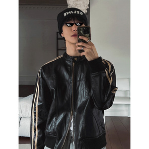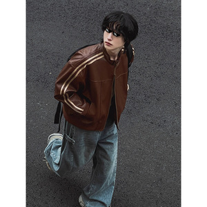 美拉德棕色条纹皮衣男士秋季短款机车服夹克痞帅风高级感立领外套