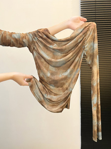 名媛风设计感一字肩网纱上衣薄款微透防晒衫扎染褶皱收腰斜肩T恤