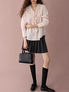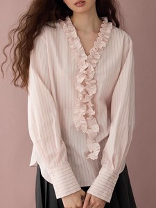 法式甜美花边条纹衬衫女2025早秋新款宽松显瘦上衣木耳边v领衬衣