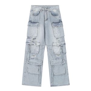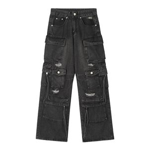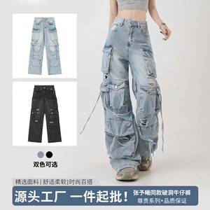 2025新款原创美式多口袋破洞牛仔裤女小众设计高腰阔腿绑带裤子