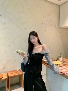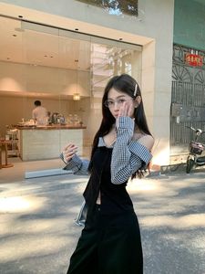 气质温柔风假两件设计格子拼接T恤女2025年新款辣妹修身百搭上衣
