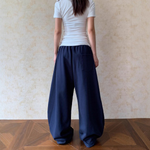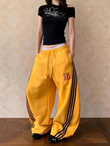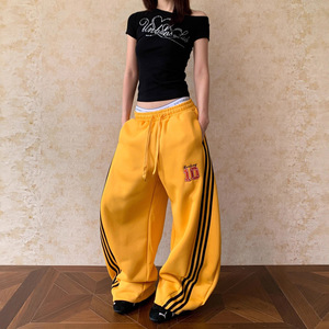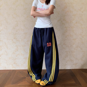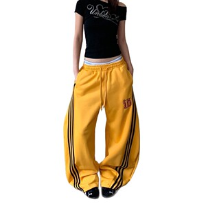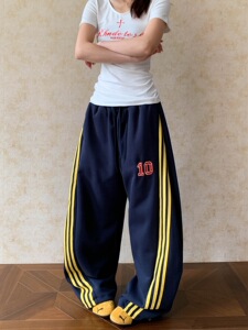 复古撞色条纹运动阔腿卫裤女潮流宽松嘻哈街舞宽松休闲百搭弯刀裤
