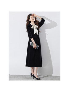 休闲加绒加厚大码秋冬装法式气质丝绒连衣裙新款修身蝴蝶结长裙女
