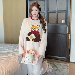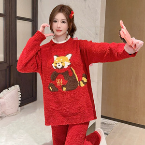 新款半边绒可爱小浣熊睡衣女秋冬保暖加厚时尚大气长袖套头家居服