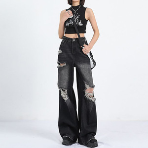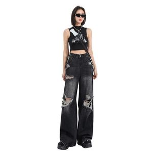 美式高街黑色破洞牛仔裤女夏季新款ins潮牌直筒宽松拖地阔腿裤子