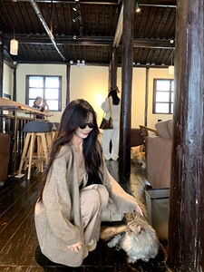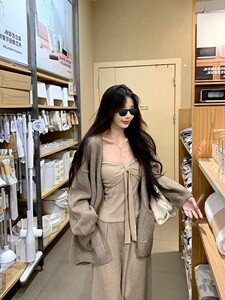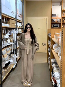 一颗甜桃yikett《慵懒感天菜》早秋长袖针织开衫休闲裤吊带三件套