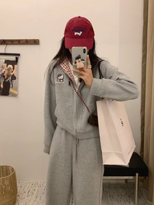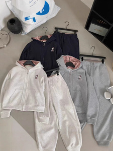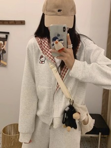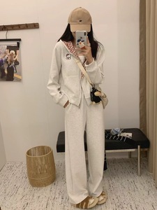 秋季韩版休闲简约卡通刺绣宽松连帽卫衣外套卫裤两件套套装女1145