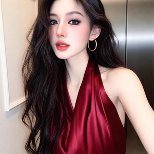 酒红色挂脖上衣2025夏季法式独特精致绝美漂亮气质名媛高级感衬衫