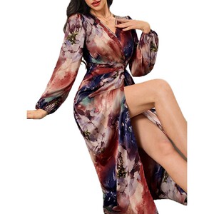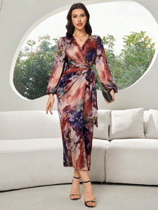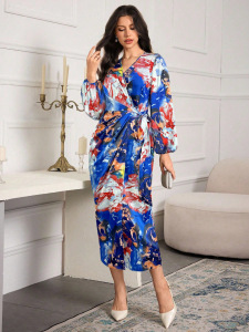 2025新款 外贸气质优雅通勤风格女装 印花V领开衫系带修身连衣裙