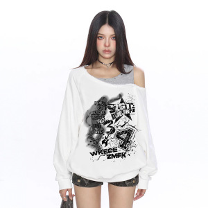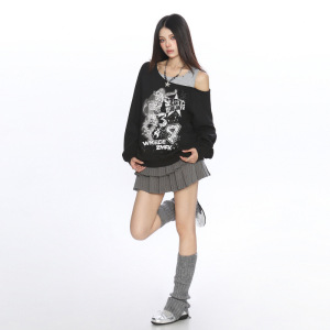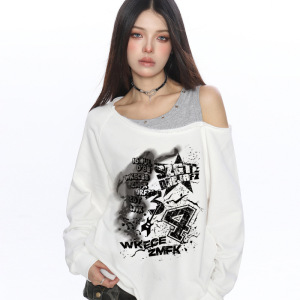 美式辣妹假两件露肩卫衣女2025新款秋季设计感宽松慵懒风斜肩上衣