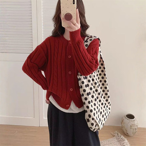 韩系麻花圆领毛衣外套女2025秋冬新款宽松显瘦慵懒风针织开衫上衣