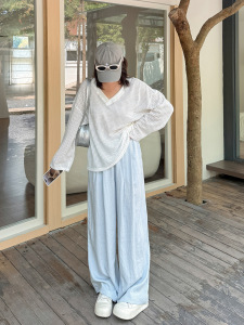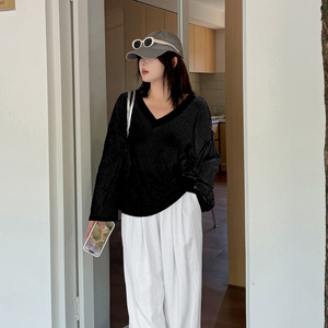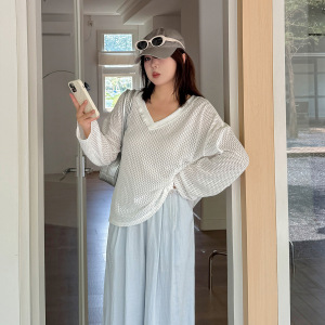 k3130大码女装V领长袖微透T恤衫打底衫蕾丝胖妹妹300斤上衣