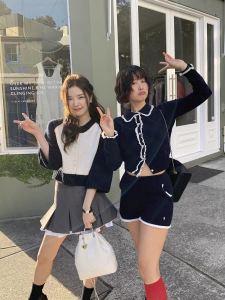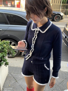 现货2025秋季新款韩版th*Bar*net气质翻领撞色花边针织开衫上衣女