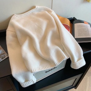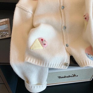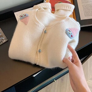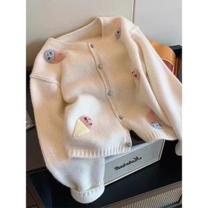 韩版米白色刺绣冰激凌针织开衫春秋新款宽松软糯小个子高级感上衣