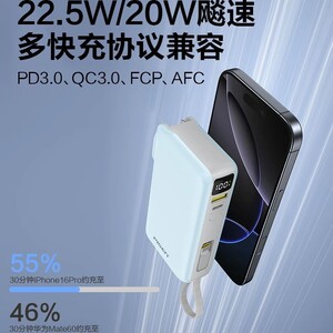 品胜1万毫安自带AC插头充电宝带双线22.5W快充便携定 制移动电源