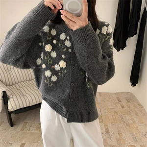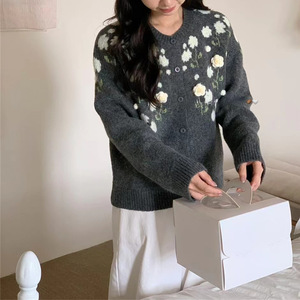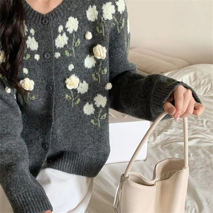 韩风温柔立体花朵细腻软糯毛衣开衫女气质高级感圆领宽松针织外套