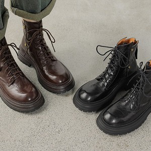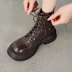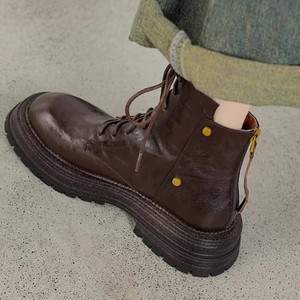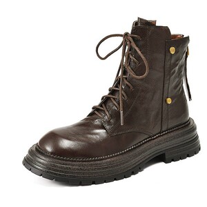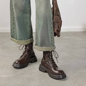 软羊皮棕色厚底真皮短靴女2025秋冬新款圆头复古百搭英伦风马丁靴