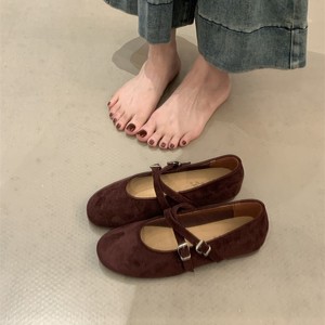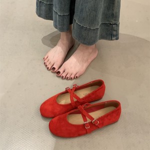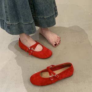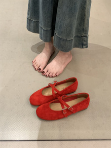 2025秋新款交叉扣带红色婚鞋玛丽珍单鞋软底芭蕾舞平底女鞋子