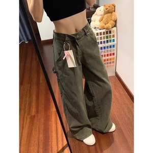 美式军绿色工装裤女生新款多口袋复古休闲阔腿宽松直筒微喇牛仔裤