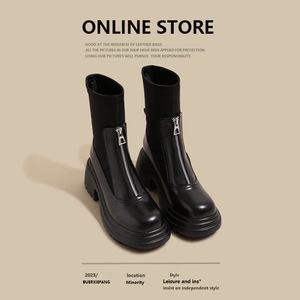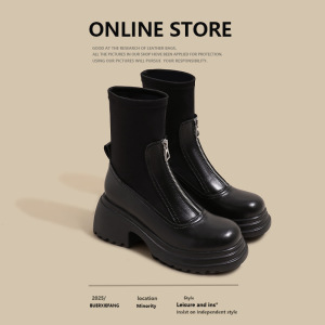 真皮版法式英伦风厚底粗跟增高弹力靴2025秋新款拉链圆头时装靴女