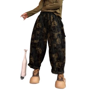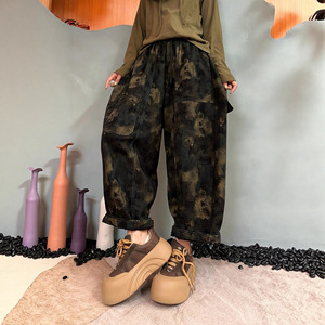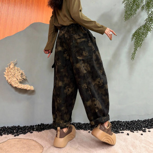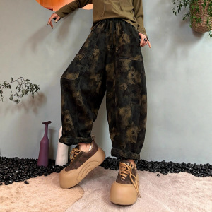2025年秋季新品复古文艺百搭宽松大码印花牛仔裤拼接哈伦老爹裤