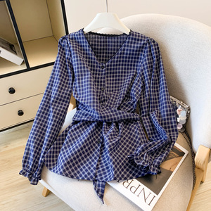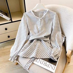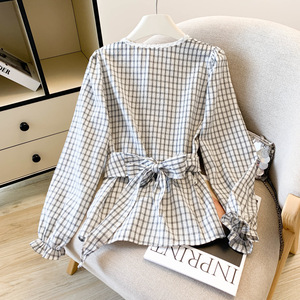 现货 秋季新款蕾丝花边收腰格子长袖衬衫显瘦衬衣上衣女洋气