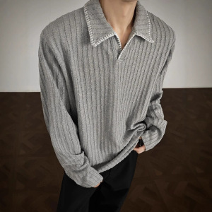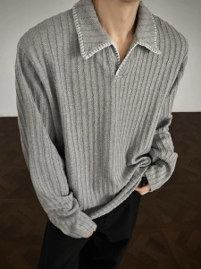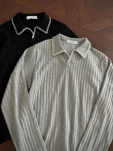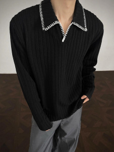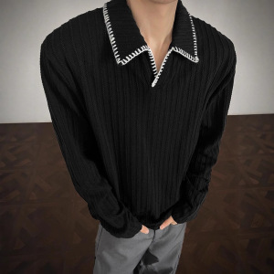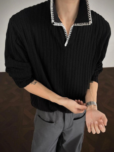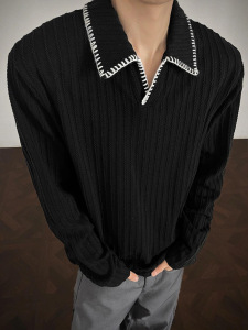 黑色麦穗纹老钱风polo衫长袖t恤男秋季学院风高级感卫衣美式上衣