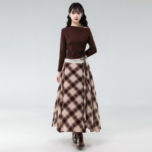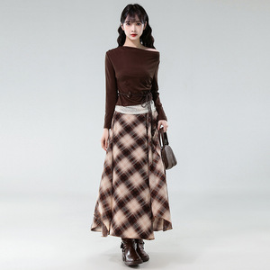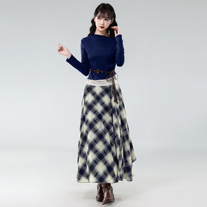 6605 跨境外贸女装新款时尚复古拼接蕾丝长袖上衣配格纹半身裙套