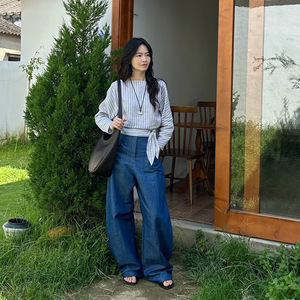 韩国东大门2025秋新复古休闲简约显瘦圆领长袖竖条纹腰部绑带衬衫