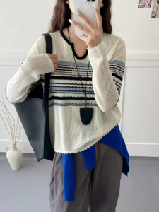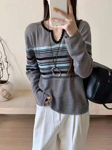 濮院羊毛衫秋季新款u领条纹薄长袖打底衫高品质上衣韩版毛衣女装