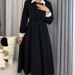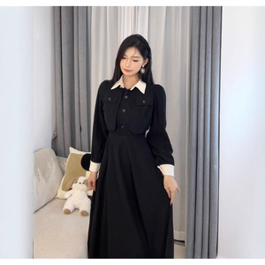早秋季裙子2025年新款黑色法式连衣裙女春秋装内搭假两件收腰长裙