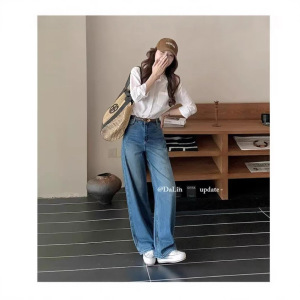 丹宁蓝弯刀牛仔裤女2025年新款高腰宽松长裤春秋季设计感阔腿裤子