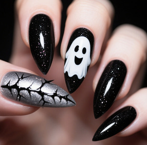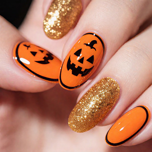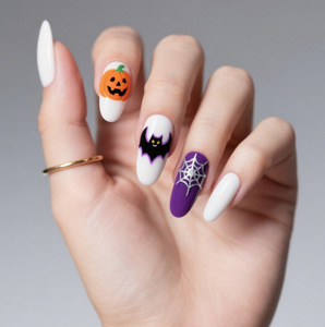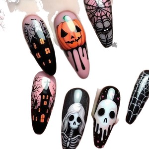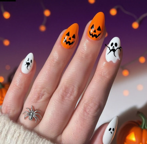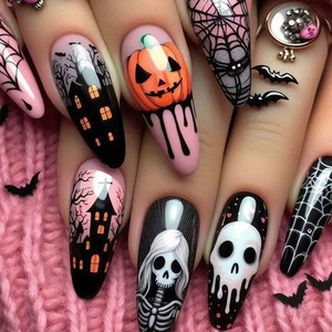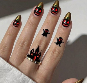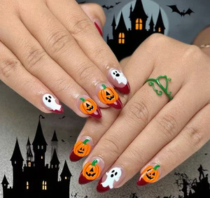 欧美跨境美甲贴片辣妹狂欢万圣节南瓜中长款杏仁形穿戴甲甲片批发