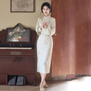米白色国风新中式长款秋季长袖旗袍改良年轻款女高级感复古秋冬装