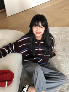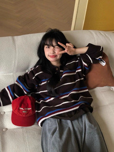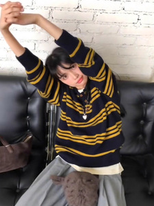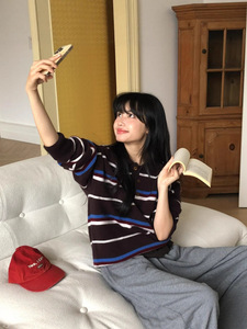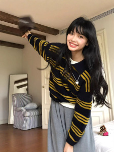 学院风复古撞色条纹毛衣女短款2025早秋新款宽松针织衫polo领上衣