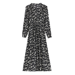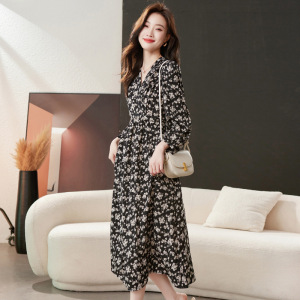 长袖黑色碎花连衣裙女2025秋季新款法式复古收腰气质修身显瘦长裙