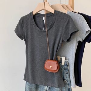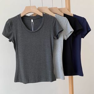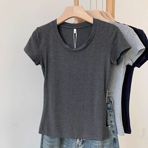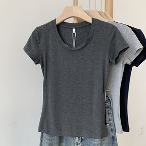 纯欲深色显瘦莫代尔短袖t恤女夏季U领露锁骨正肩修身显身材上衣