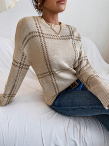 复古慵懒风秋冬圆领毛衣休闲百搭格子条纹内搭针织衫欧美跨境圆领