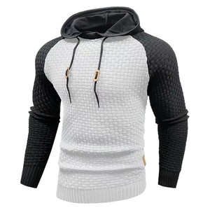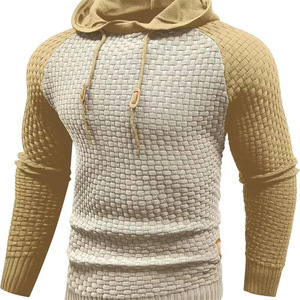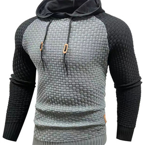 2025外贸新款男士拼色小方格卫衣休闲修身连帽上衣长袖针织套头衫
