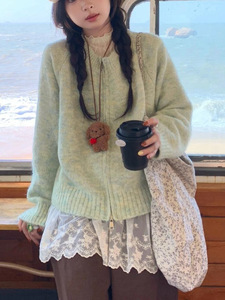 绿色毛衣外套女款2025新款春秋韩系独特超好看慵懒风宽松针织开衫