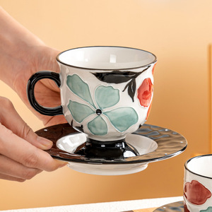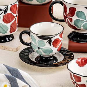 手绘繁花咖啡杯碟套装中式浮雕花朵陶瓷杯复古高级感咖啡杯餐厅用