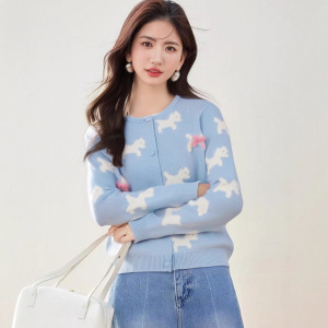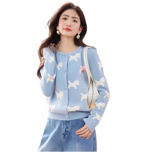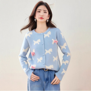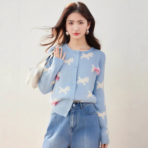 蓝色蝴蝶结提花小狗毛衣开衫女2025秋季款温柔奶呼呼软糯针织外套