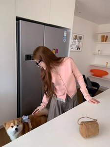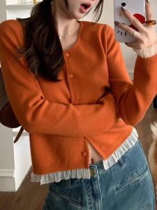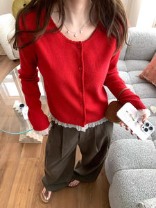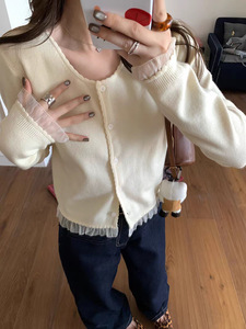 im向 日光圆舞曲~早秋圆领针织衫女蕾丝花边假两件拼接毛衣开衫