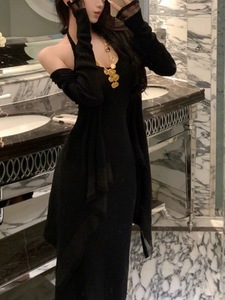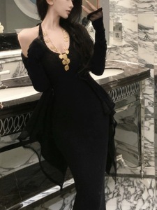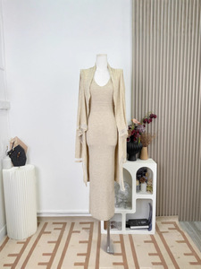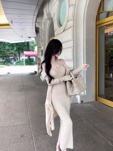 羊毛镂空长袖针织开衫包臀收腰鱼尾连衣裙套装