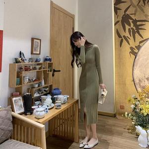 针织连衣裙女秋冬新款圆领百搭修身洋气开叉打底毛衣过膝内搭长裙