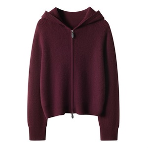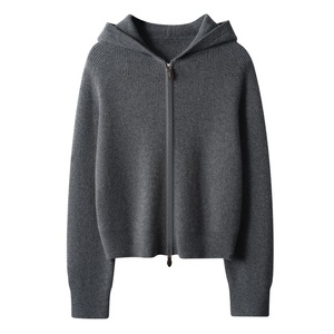 女士连帽简约纯色破边拉链针织开衫宽松休闲减龄纯羊绒新款开衫