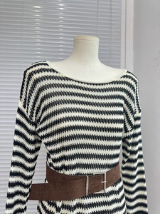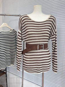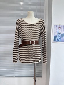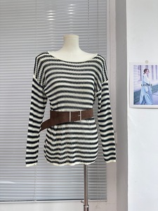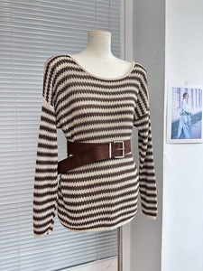 韩版复古慵懒风条纹圆领系带收腰设计感百搭宽松减龄针织上衣女