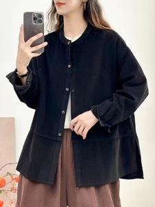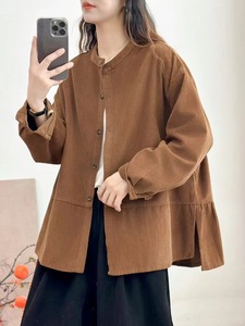 古咖服饰秋季新复古灯芯绒外套女立领单排扣拼接长袖宽松外搭上衣