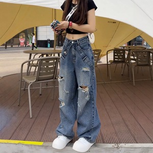大码破洞阔腿牛仔裤女2025新款复古胖mm显瘦宽松美式直筒弯刀裤子