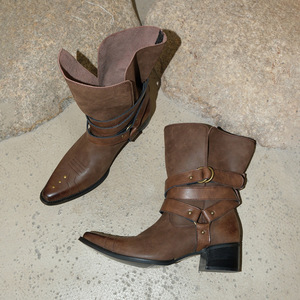 牛皮版~法式复古真皮绑带西部牛仔靴新款百搭小众设计感时装靴女